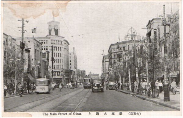 東京銀座大道(圖左方有鐘的建物是1981年設立的和光百貨)